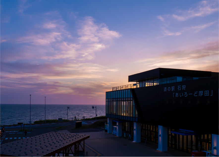 石狩市を縦断する国道231号線(通称:オロロンライン)沿いに立つ、道の駅石狩「あいろーど厚田」。最上階の展望フロアは、日本海を一望する石狩屈指の絶景スポット。夕暮れ時には、夕日が日本海を染めながら水平線に向かって沈んでいく、数分間の感動体験が待っています。